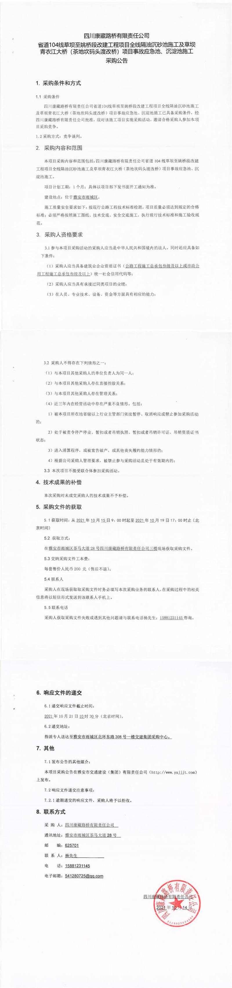 四川康藏路橋有限責(zé)任公司省道104線草壩至姚橋段改建項(xiàng)目全線隔油沉砂池施工及草壩青衣江大橋(茶地坎碼頭渡改橋)項(xiàng)目事故應(yīng)急池、沉淀池施工采購(gòu)公告