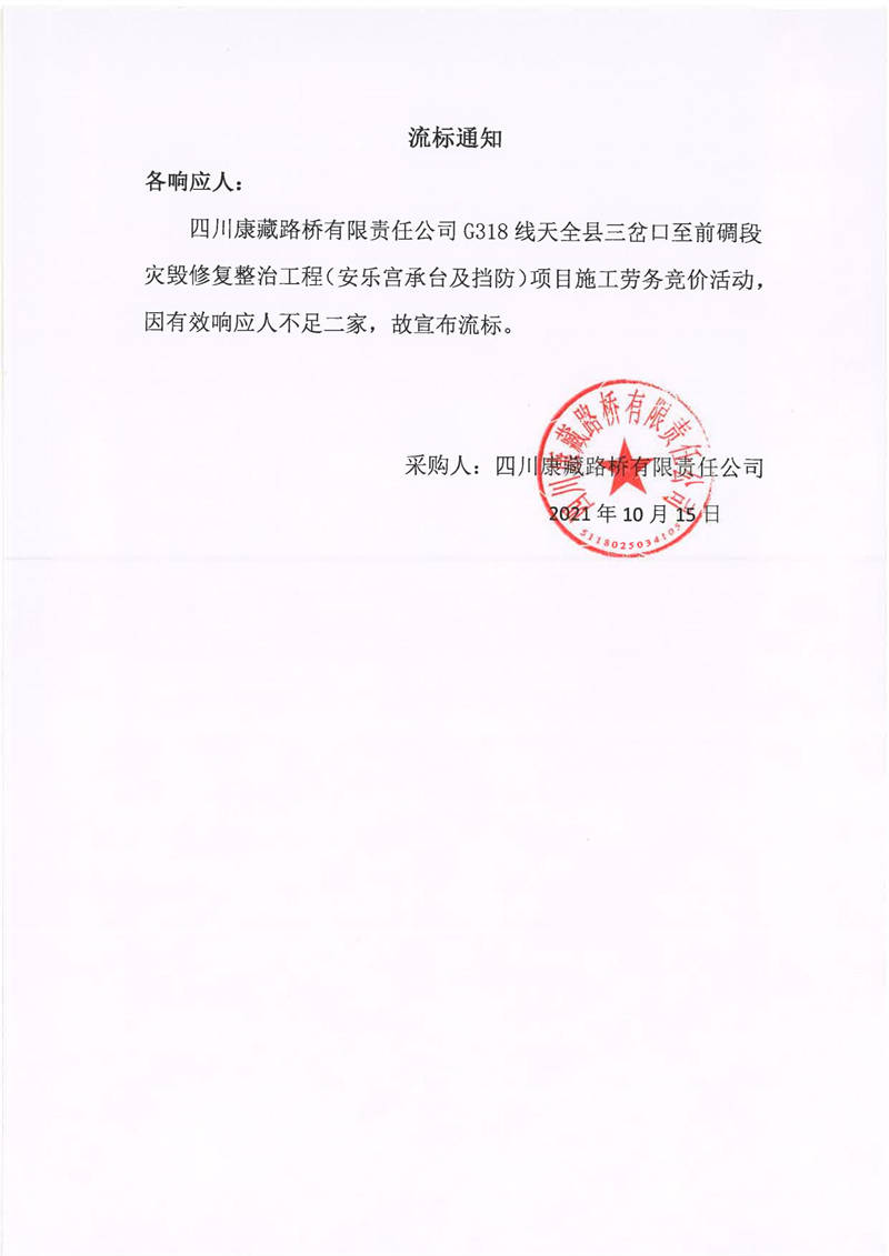 四川康藏路橋有限責(zé)任公司G318線天全縣三岔口至前碉段災(zāi)毀修復(fù)整治工程(安樂宮承臺(tái)及擋防)項(xiàng)目施工勞務(wù)流標(biāo)通知