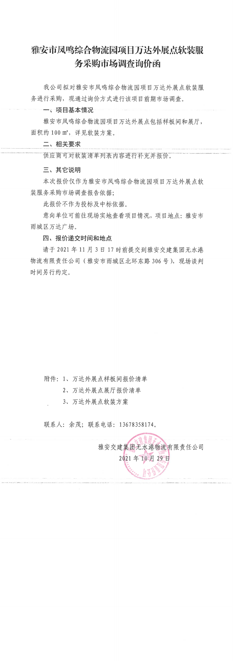 雅安交建集團(tuán)無水港物流有限責(zé)任公司雅安市鳳鳴綜合物流園項(xiàng)目萬達(dá)外展點(diǎn)軟裝服務(wù)采購市場調(diào)查詢價(jià)函