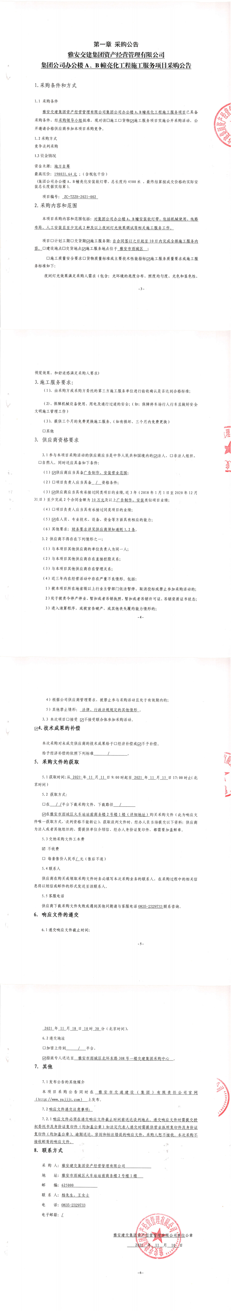 雅安交建集團(tuán)資產(chǎn)經(jīng)營管理有限公司集團(tuán)公司辦公樓A、B幢亮化工程施工服務(wù)項(xiàng)目采購公告