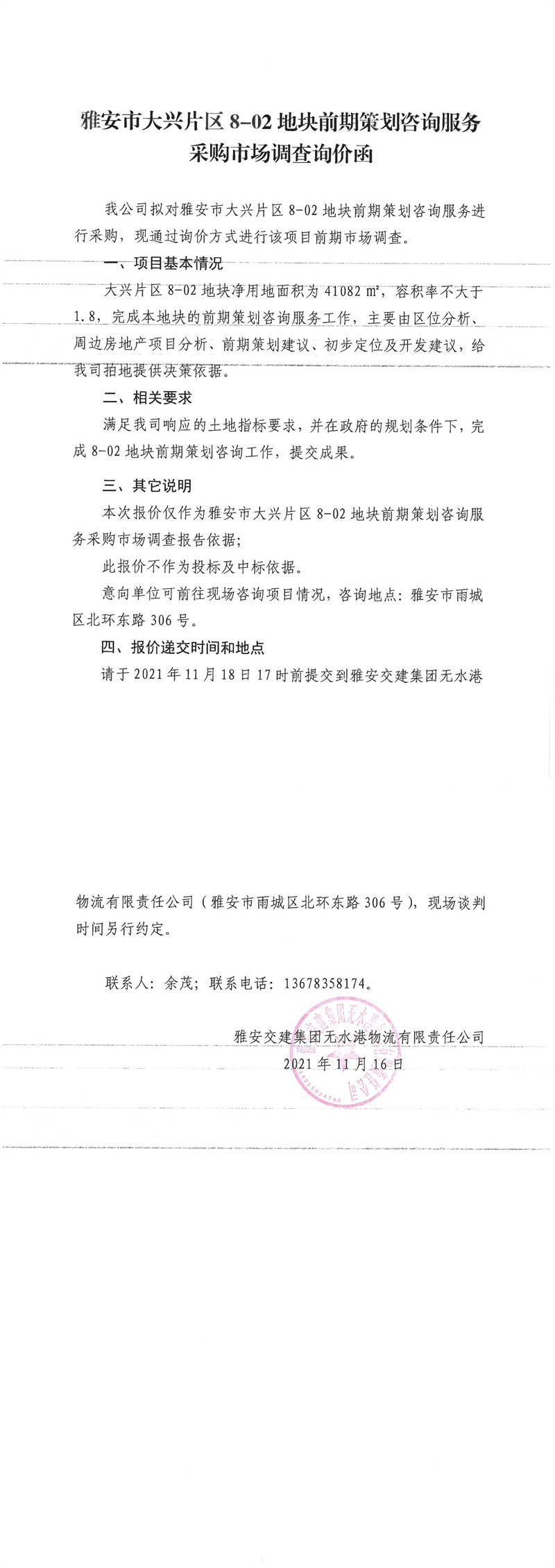 雅安交建集團無水港物流有限責任公司雅安市大興片區(qū)8-02地塊前期策劃咨詢服務(wù)采購市場調(diào)查詢價函