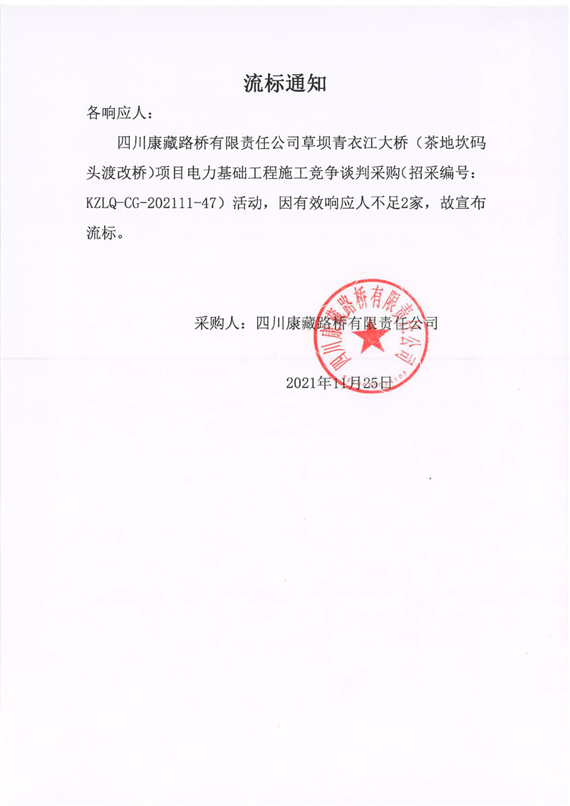 四川康藏路橋有限責任公司草壩青衣江大橋(茶地坎碼頭渡改橋)項目電力基礎工程施工競爭談判采購流標通知
