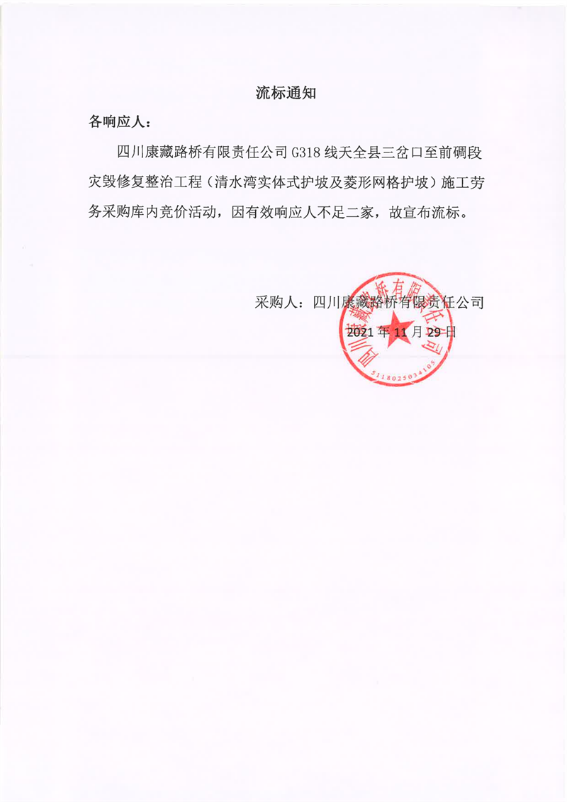 四川康藏路橋有限責任公司G318線天全縣三岔口至前碉段災(zāi)毀修復(fù)整治工程(清水灣實體式護坡及菱形網(wǎng)格護坡)施工勞務(wù)采購流標通知