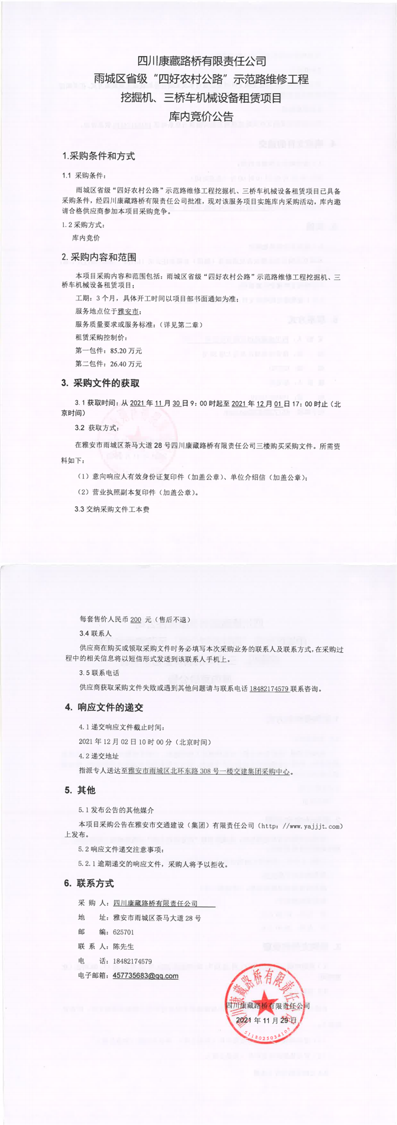 四川康藏路橋有限責(zé)任公司雨城區(qū)省級“四好農(nóng)村公路”示范路維修工程挖掘機、三橋車機械設(shè)備租賃項目庫內(nèi)競價公告