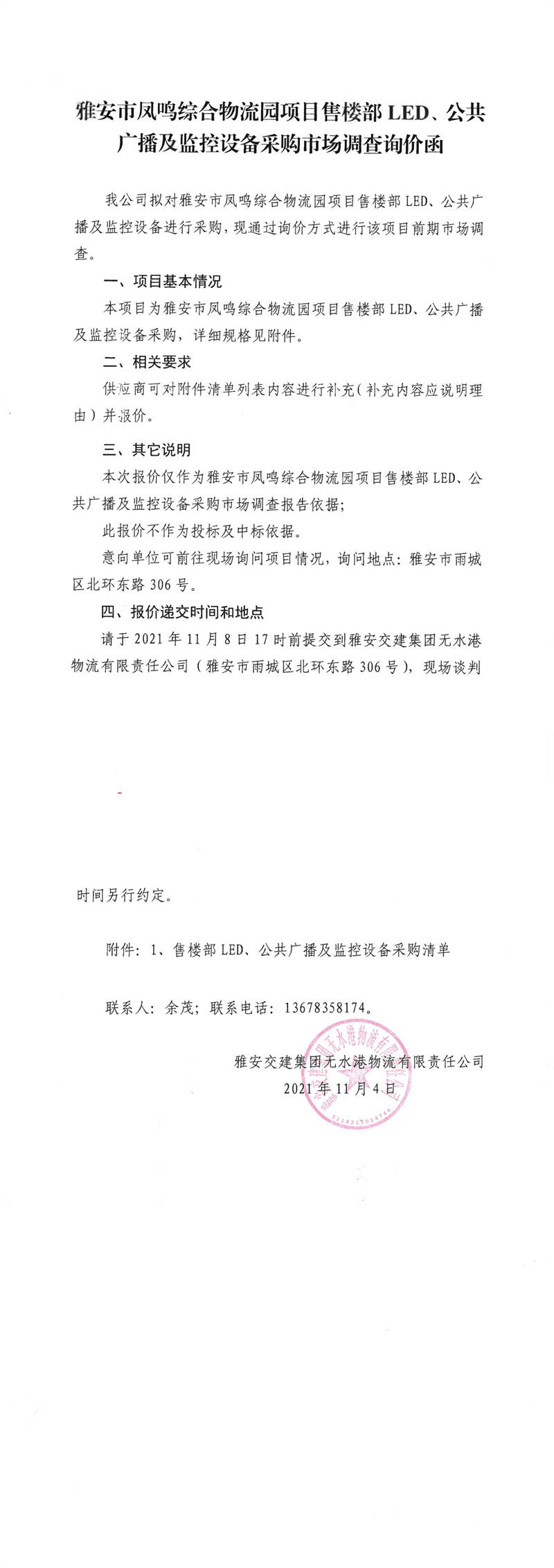 雅安交建集團(tuán)無水港物流有限責(zé)任公司雅安市鳳鳴綜合物流園項目售樓部LED、公共廣播及監(jiān)控設(shè)備采購市場調(diào)查詢價函