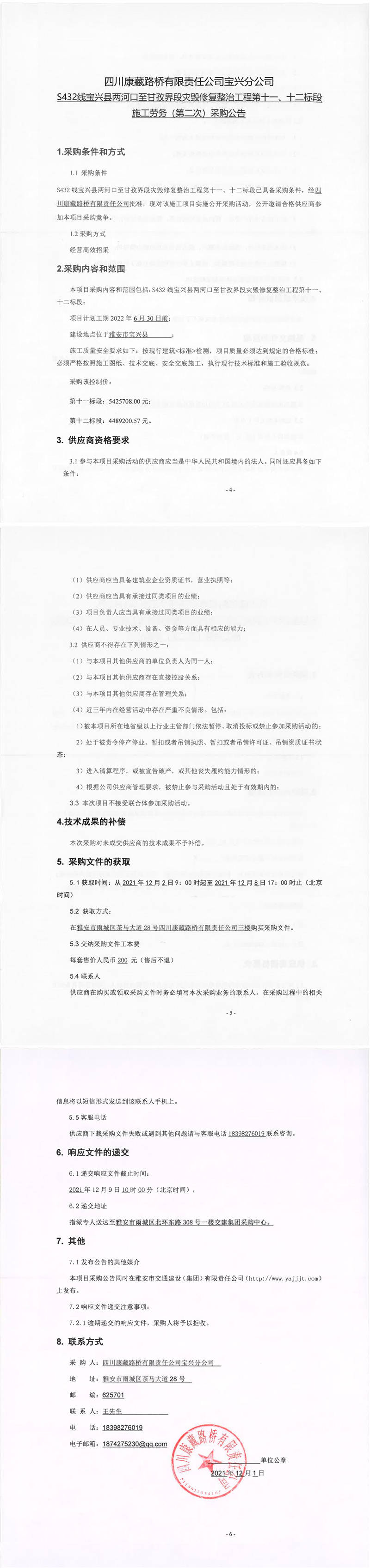 四川康藏路橋有限責任公司S432線寶興縣兩河口至甘孜界段災毀修復整治工程第十一、十二標段施工勞務(wù)(第二次)采購公告