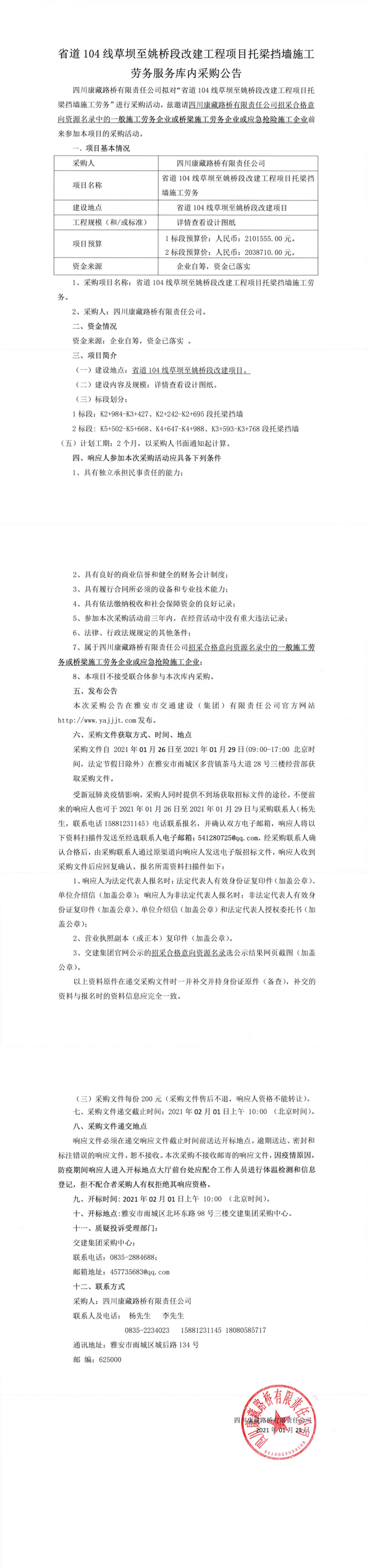 四川康藏路橋有限責任公司省道104線草壩至姚橋段改建工程項目托梁擋墻施工勞務服務庫內(nèi)采購公告