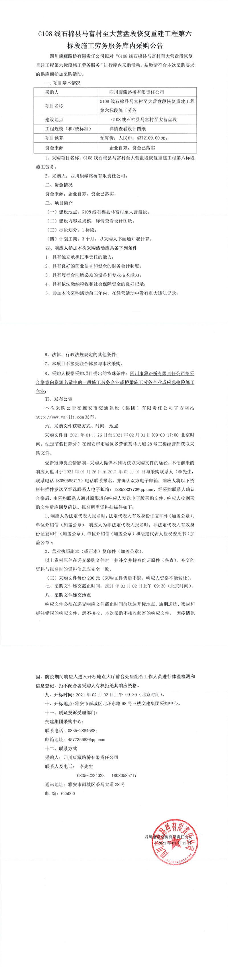 四川康藏路橋有限公司G108線石棉縣馬富村至大營盤段恢復(fù)重建工程第六標(biāo)段施工勞務(wù)服務(wù)庫內(nèi)采購公告