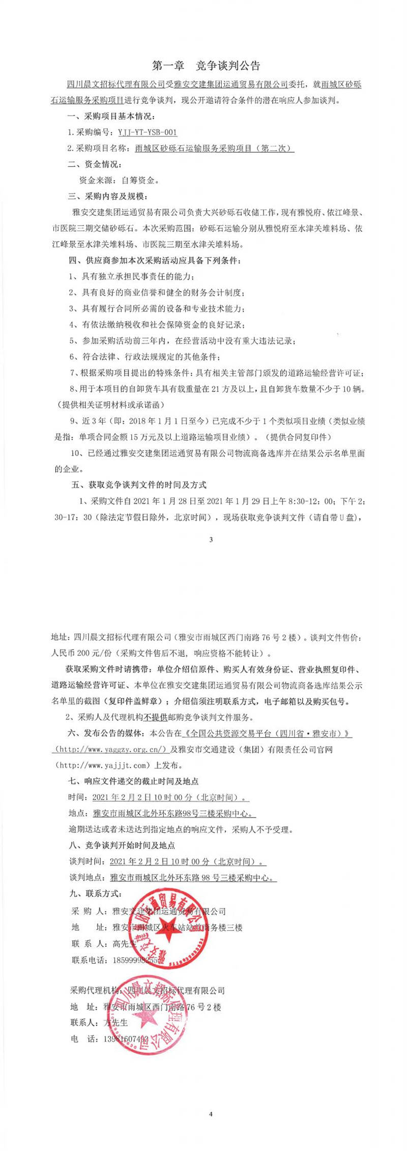 雅安交建集團運通貿(mào)易有限公司雨城區(qū)砂礫石運輸服務采購項目(第二次)競爭談判公告