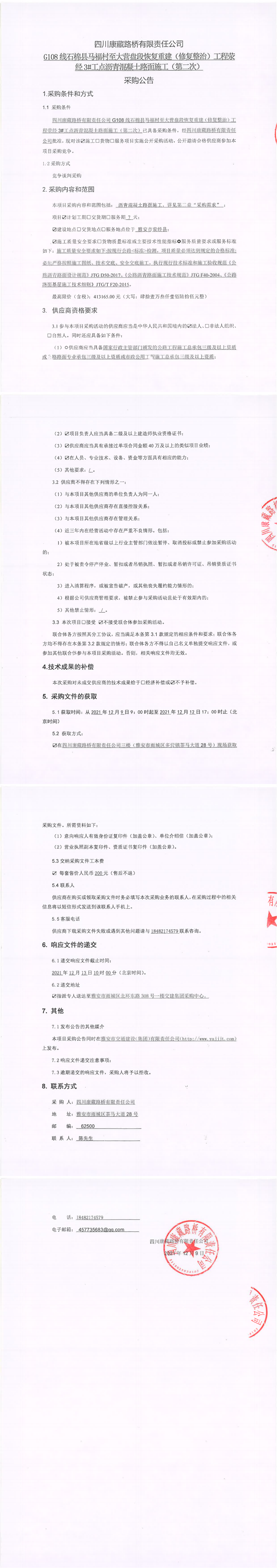四川康藏路橋有限責(zé)任公司G108線石棉縣馬福村至大營(yíng)盤(pán)段恢復(fù)重建(修復(fù)整治)工程滎經(jīng)3#工點(diǎn)瀝青混凝土路面施工(第二次)采購(gòu)公告