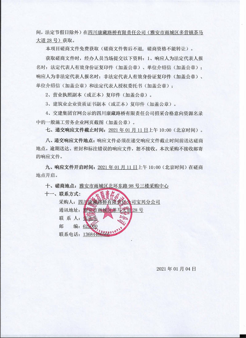 四川康藏路橋有限責任公司寶興分公司省道432線雅安段擴建工程K19新建拌合站施工勞務磋商公告(第二次)
