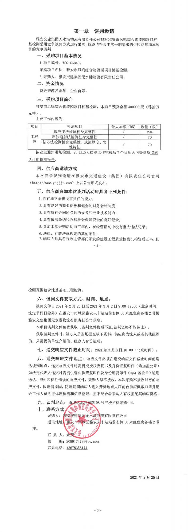 雅安交建集團(tuán)無水港物流有限責(zé)任公司雅安市鳳鳴綜合物流園項目樁基檢測競爭談判公告