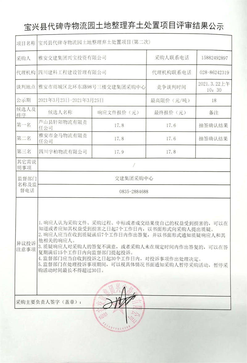 雅安交建集團興寶投資有限公司寶興縣代碑寺物流園土地整理棄土處置項目評審結果公示
