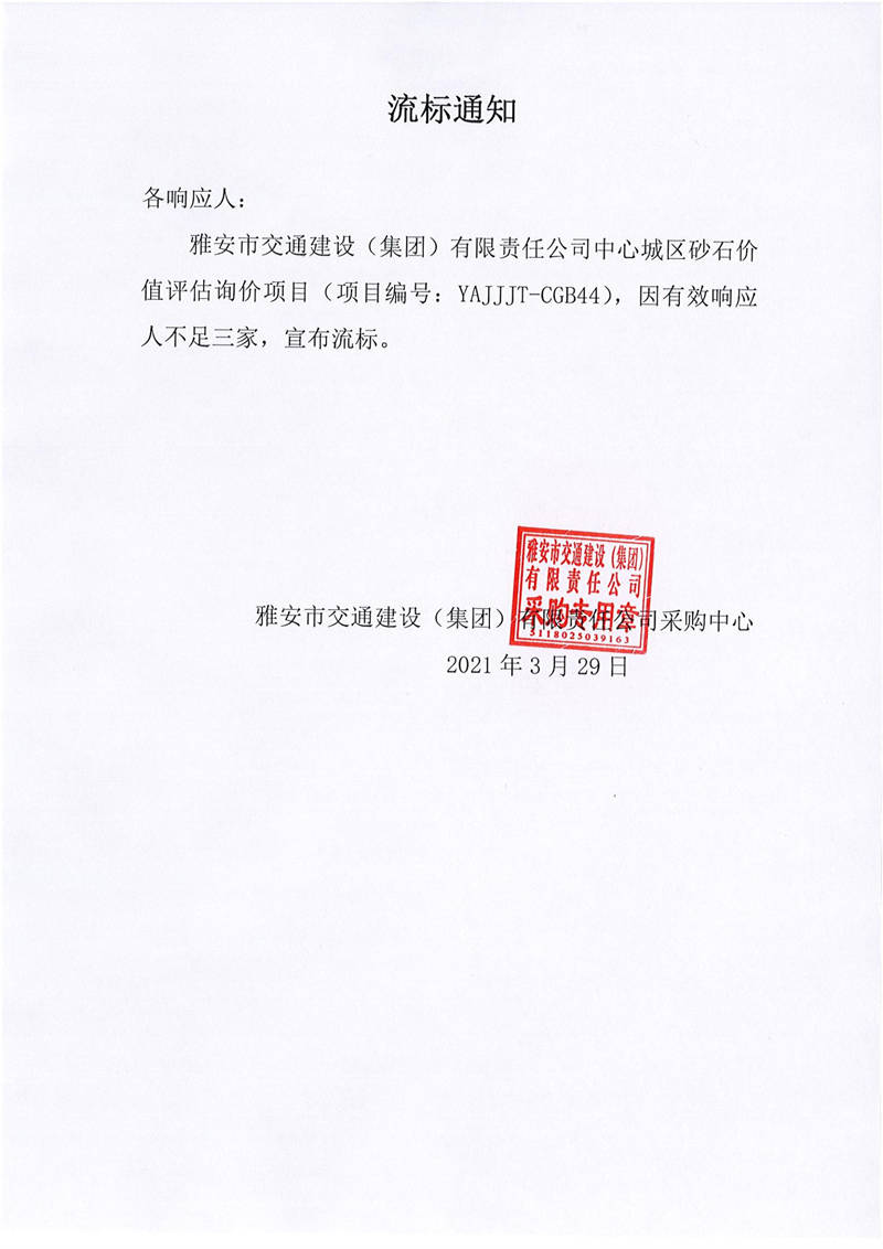 雅安市交通建設(shè)(集團(tuán))有限責(zé)任公司中心城區(qū)砂石價值評估項目流標(biāo)通知