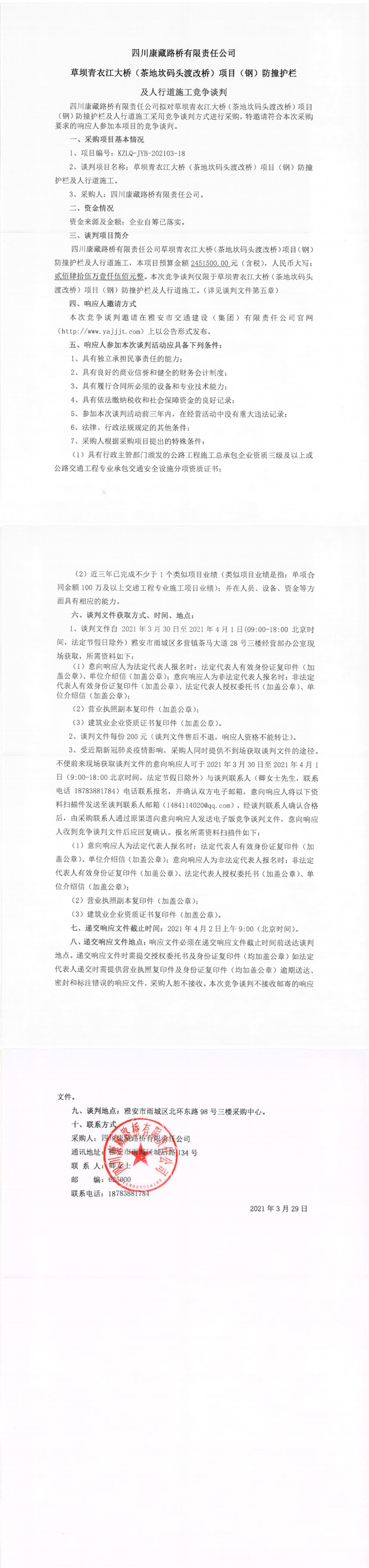 四川康藏路橋有限責(zé)任公司草壩青衣江大橋(茶地坎碼頭渡改橋)項(xiàng)目(鋼)防撞護(hù)欄及人行道施工競(jìng)爭(zhēng)談判公告
