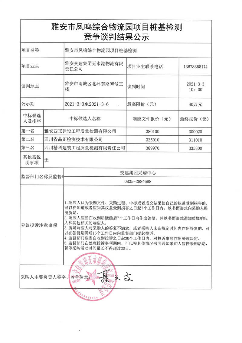 雅安交建集團(tuán)無水港物流有限責(zé)任公司雅安市鳳鳴綜合物流園項(xiàng)目樁基檢測(cè)競(jìng)爭(zhēng)談判結(jié)果公示