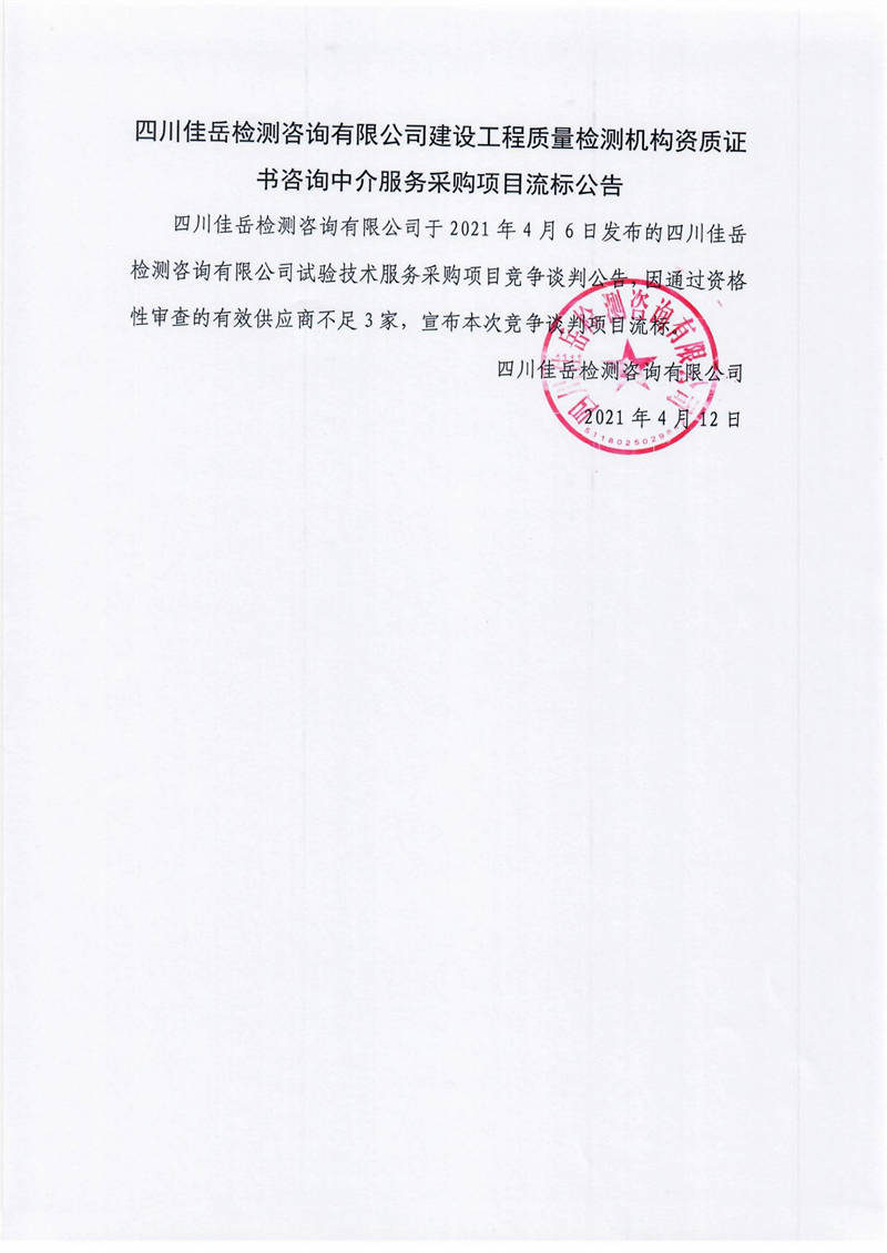 四川佳岳檢測咨詢有限公司建設(shè)工程質(zhì)量檢測機構(gòu)資質(zhì)證書咨詢中介服務(wù)采購項目流標(biāo)公告