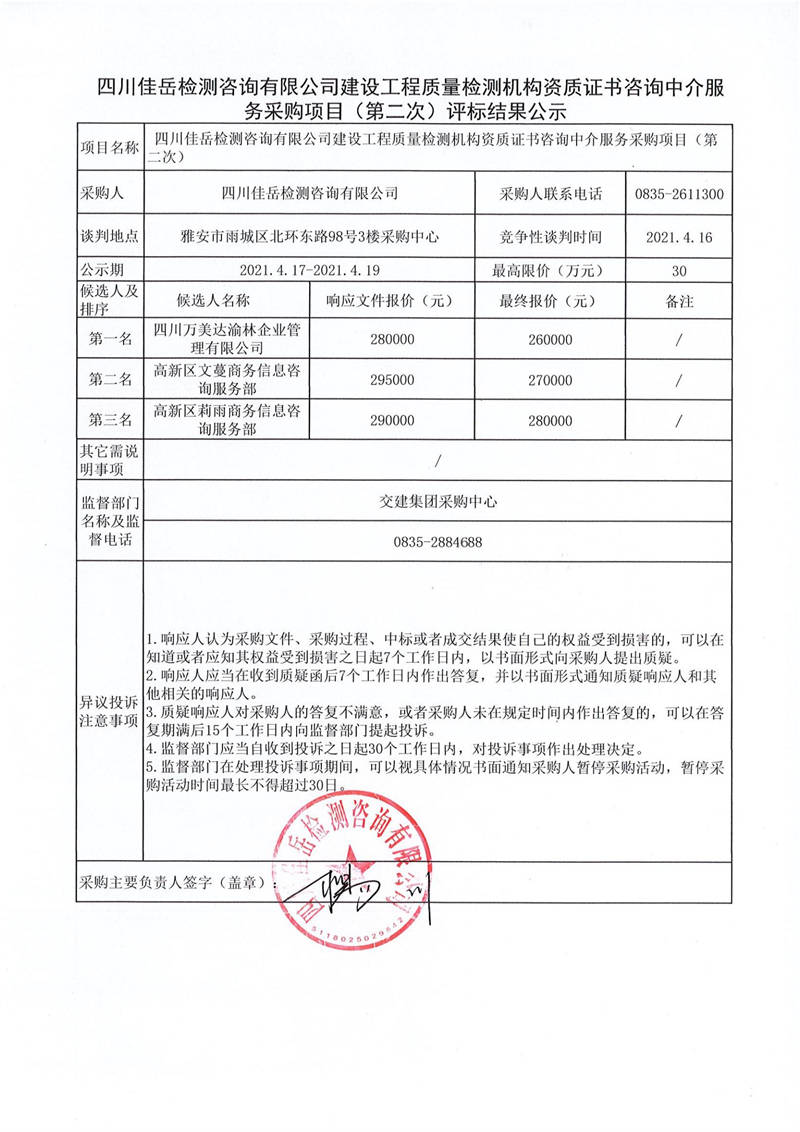 四川佳岳檢測(cè)咨詢(xún)有限公司建設(shè)工程質(zhì)量檢測(cè)機(jī)構(gòu)資質(zhì)證書(shū)咨詢(xún)中介服務(wù)采購(gòu)項(xiàng)目(第二次)評(píng)標(biāo)結(jié)果公示