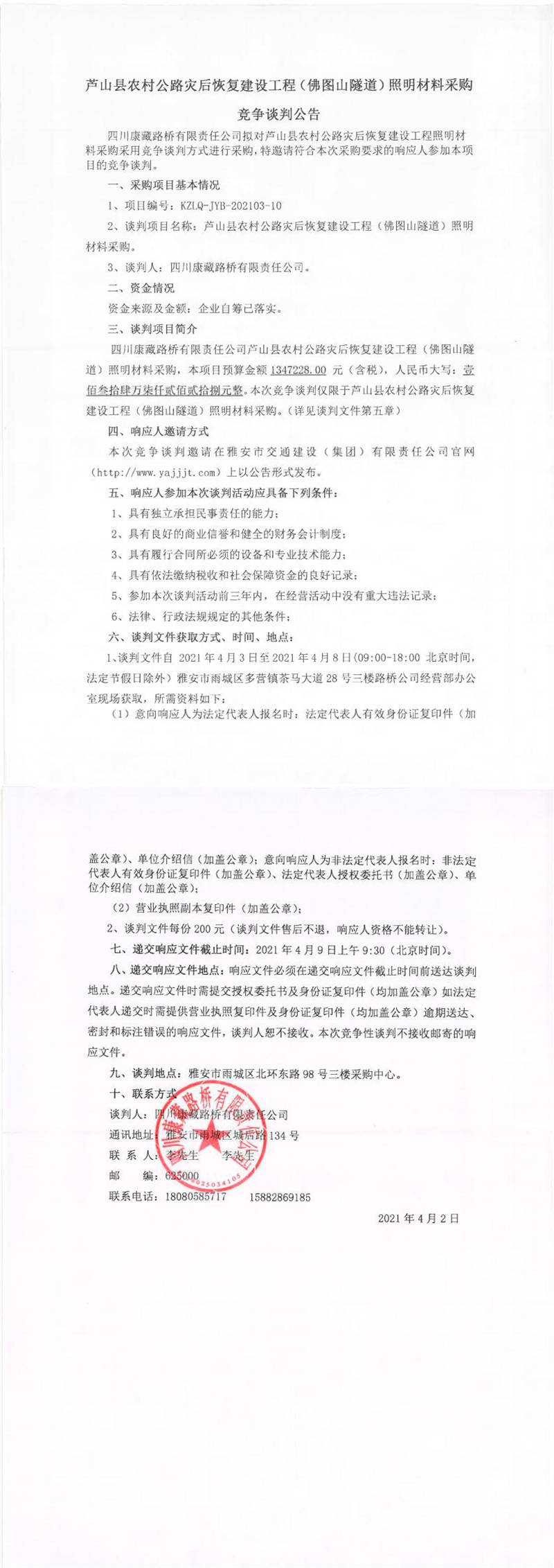 四川康藏路橋有限責任公司蘆山縣農村公路災后恢復建設工程(佛圖山隧道)照明材料采購競爭談判公告