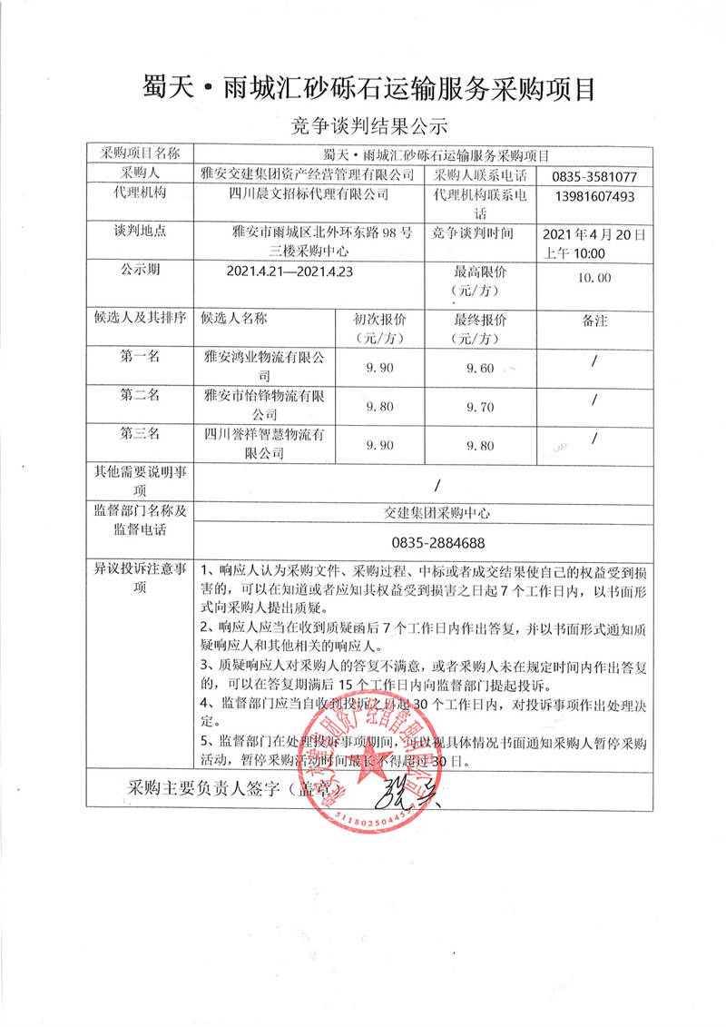 雅安交建集團資產(chǎn)經(jīng)營管理有限公司蜀天.雨城匯砂礫石運輸服務(wù)采購項目競爭談判結(jié)果公示