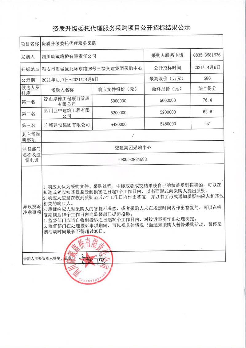 四川康藏路橋有限責(zé)任公司資質(zhì)升級(jí)委托代理服務(wù)采購(gòu)項(xiàng)目公開(kāi)招標(biāo)結(jié)果公示