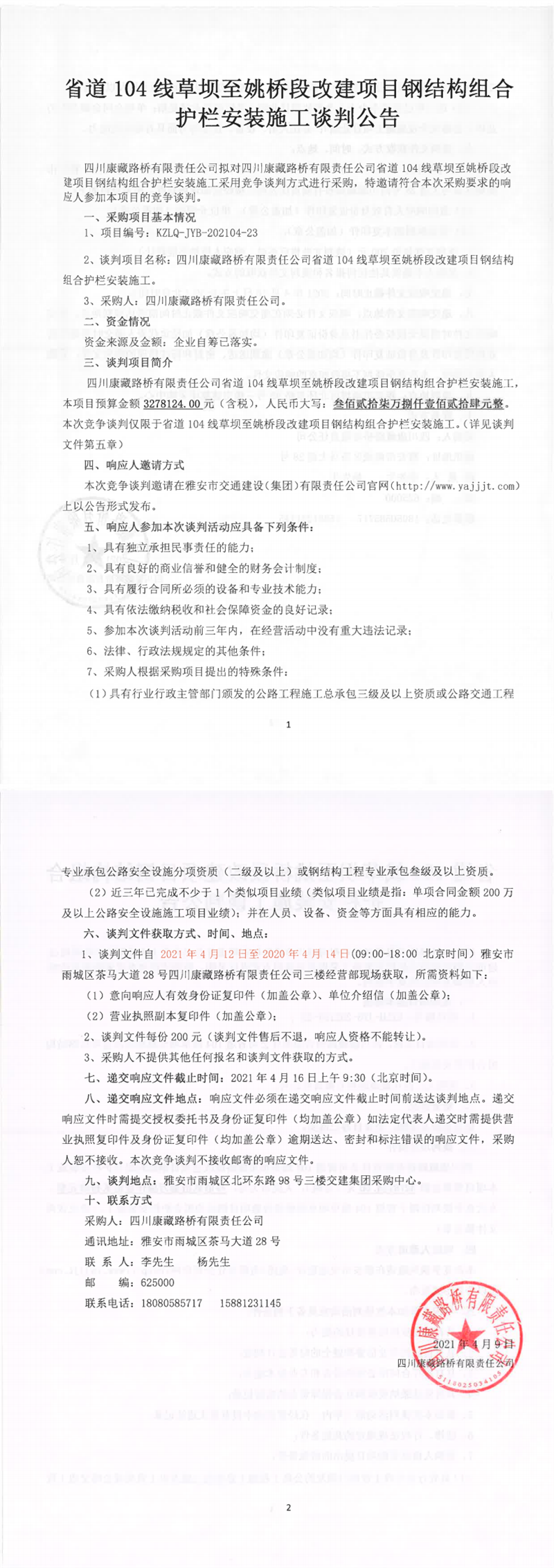 四川康藏路橋有限責任公司省道104線草壩至姚橋段改建項目鋼結(jié)構(gòu)組合護欄安裝施工談判公告