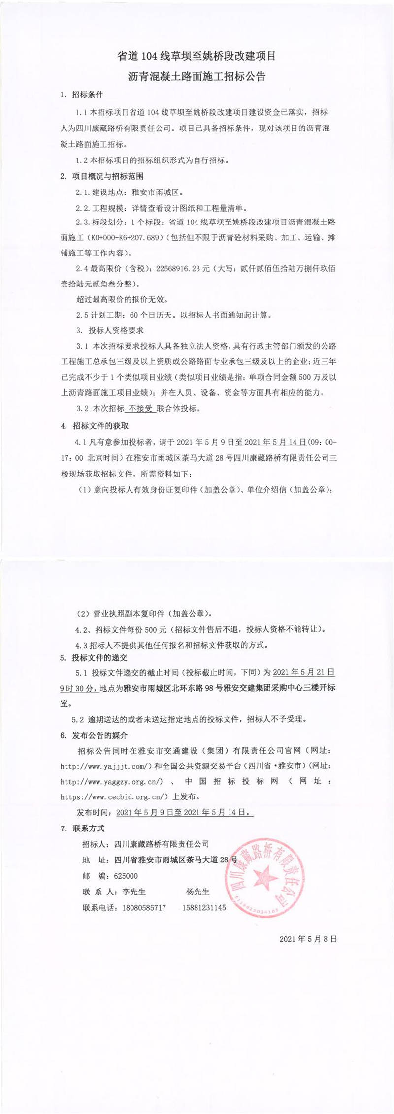 四川康藏路橋有限責(zé)任公司省道104線(xiàn)草壩至姚橋段改建項(xiàng)目瀝青混凝土路面施工招標(biāo)公告