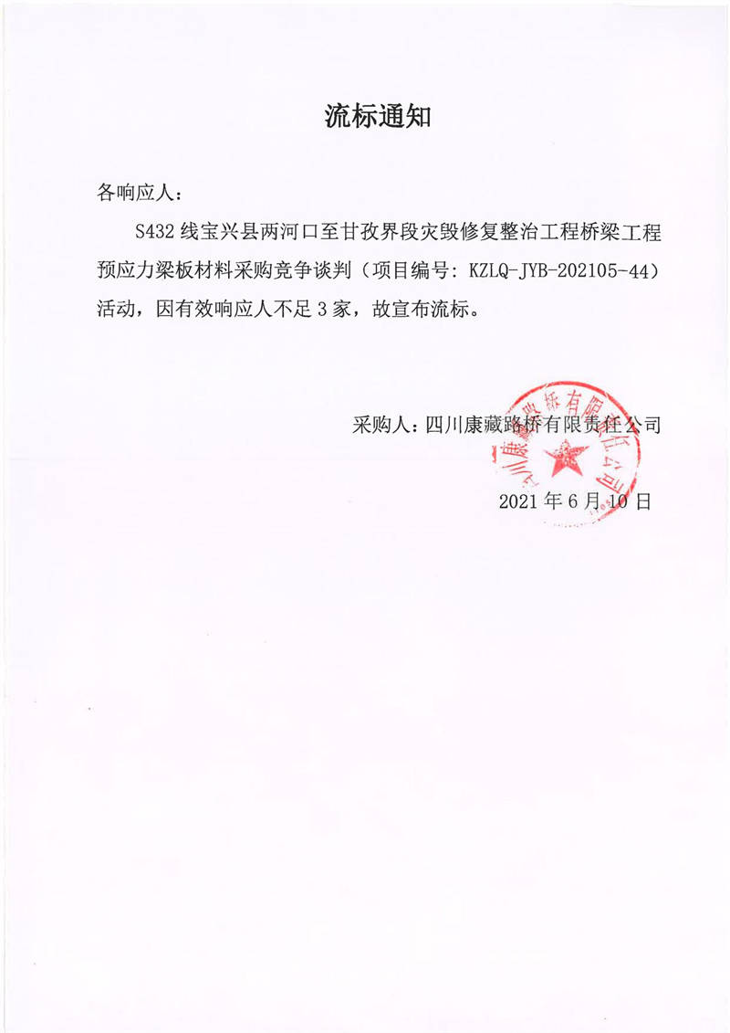 四川康藏路橋有限責任公司S432線寶興縣兩河口至甘孜界段災毀修復整治工程橋梁工程預應力梁板材料采購競爭談判流標通知