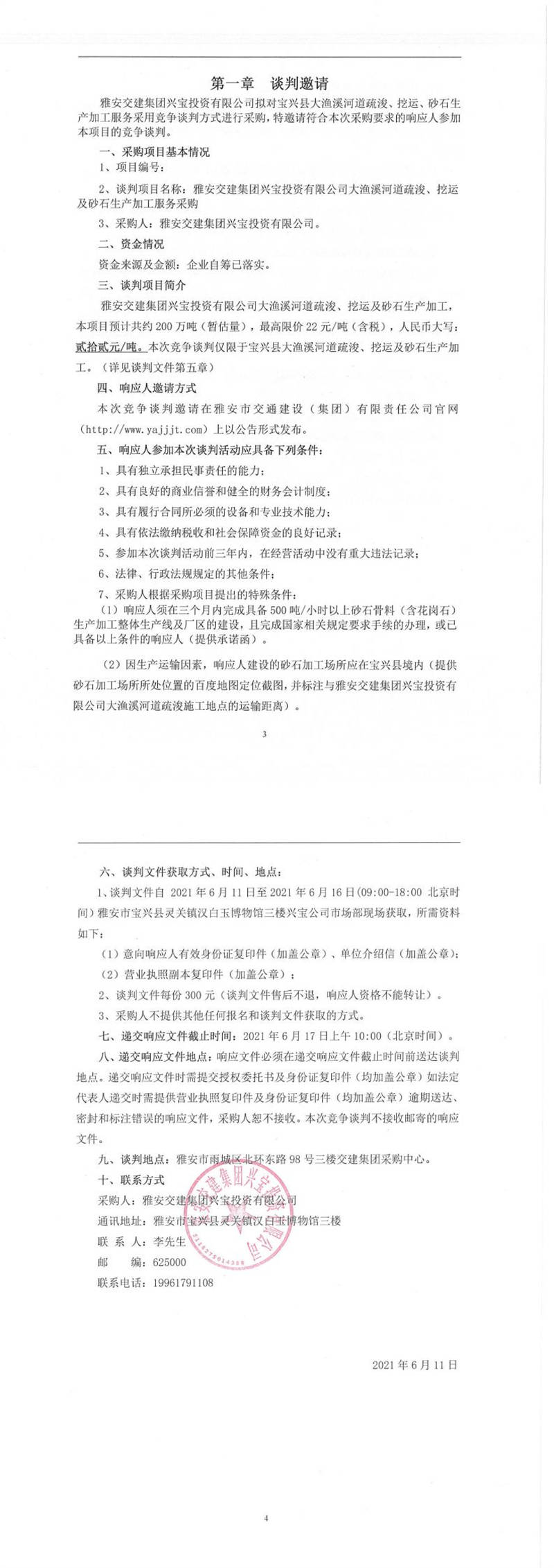 雅安交建集團興寶投資有限公司大漁溪河道疏浚、挖運及砂石生產加工服務采購競爭談判公告
