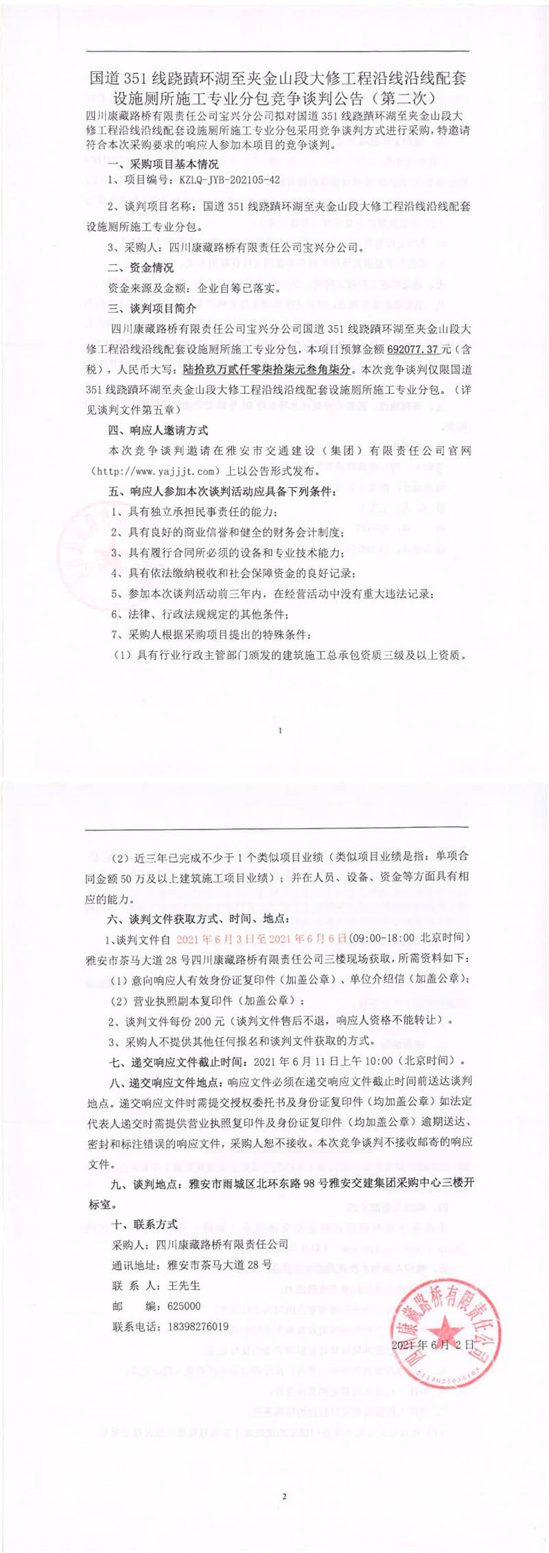 四川康藏路橋有限責任公司寶興分公司國道351線蹺磧環(huán)湖至夾金山段大修工程沿線沿線配套設施廁所施工專業(yè)分包競爭談判公告(第二次)