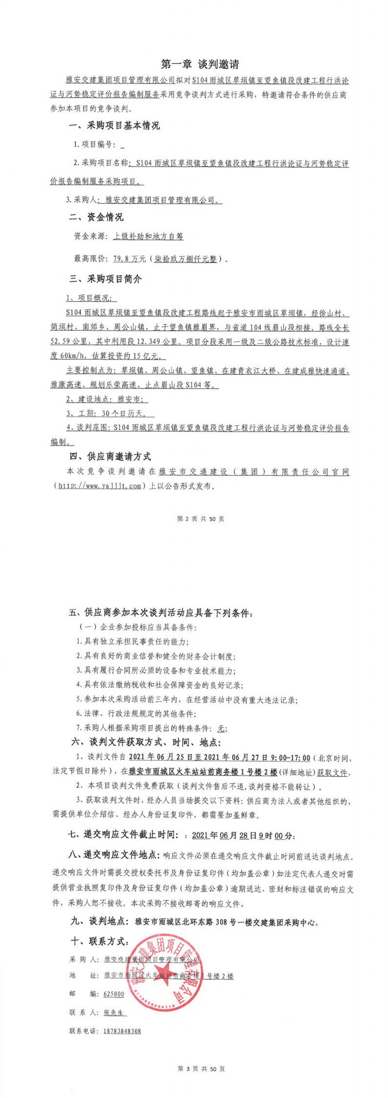 雅安交建集團(tuán)項(xiàng)目管理有限公司S104雨城區(qū)草壩鎮(zhèn)至望魚鎮(zhèn)段改建工程行洪論證與河勢(shì)穩(wěn)定評(píng)價(jià)報(bào)告編制服務(wù)采購項(xiàng)目競(jìng)爭(zhēng)談判公告