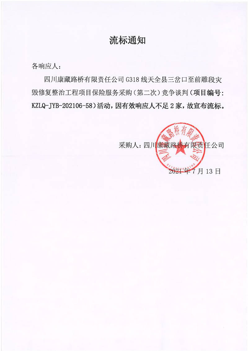 四川康藏路橋有限責(zé)任公司G318線天全縣三岔口至前雕段災(zāi)毀修復(fù)整治工程項(xiàng)目保險服務(wù)采購(第二次)流標(biāo)通知