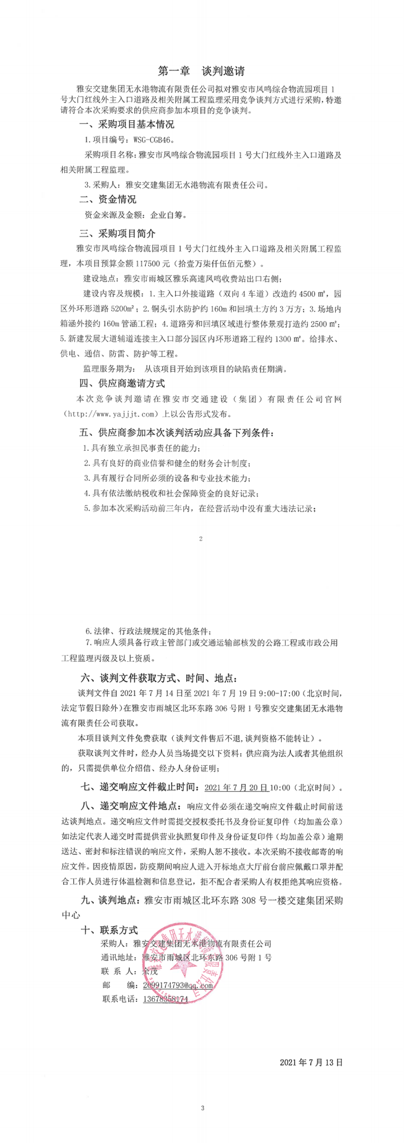 雅安交建集團無水港物流有限責任公司雅安市鳳鳴綜合物流園項目1號大門紅線外主入口道路及相關附屬工程監(jiān)理競爭談判公告