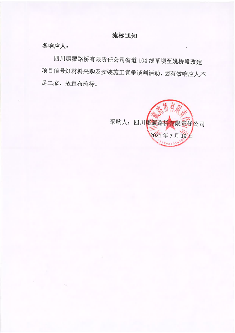 四川康藏路橋有限責(zé)任公司省道104線草壩至姚橋段改建項(xiàng)目信號燈材料采購及安裝施工競爭談判流標(biāo)通知