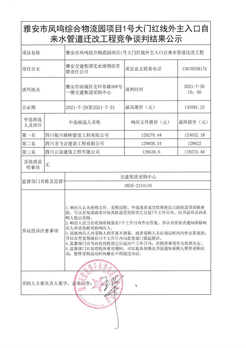 雅安交建集團(tuán)無水港物流有限責(zé)任公司雅安市鳳鳴綜合物流園項(xiàng)目1號大門紅線外主入口自來水管道遷改工程競爭談判結(jié)果公示