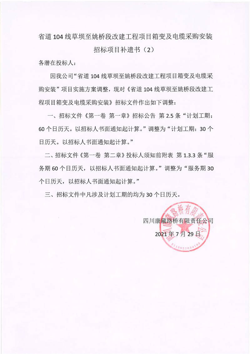 四川康藏路橋有限責(zé)任公司省道104線草壩至姚橋段改建項目箱變及電纜采購安裝招標(biāo)項目補(bǔ)遺書(2)