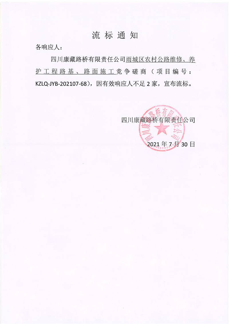 四川康藏路橋有限責(zé)任公司雨城區(qū)農(nóng)村公路維修、養(yǎng)護(hù)工程路基、路面施工競(jìng)爭(zhēng)磋商流標(biāo)通知