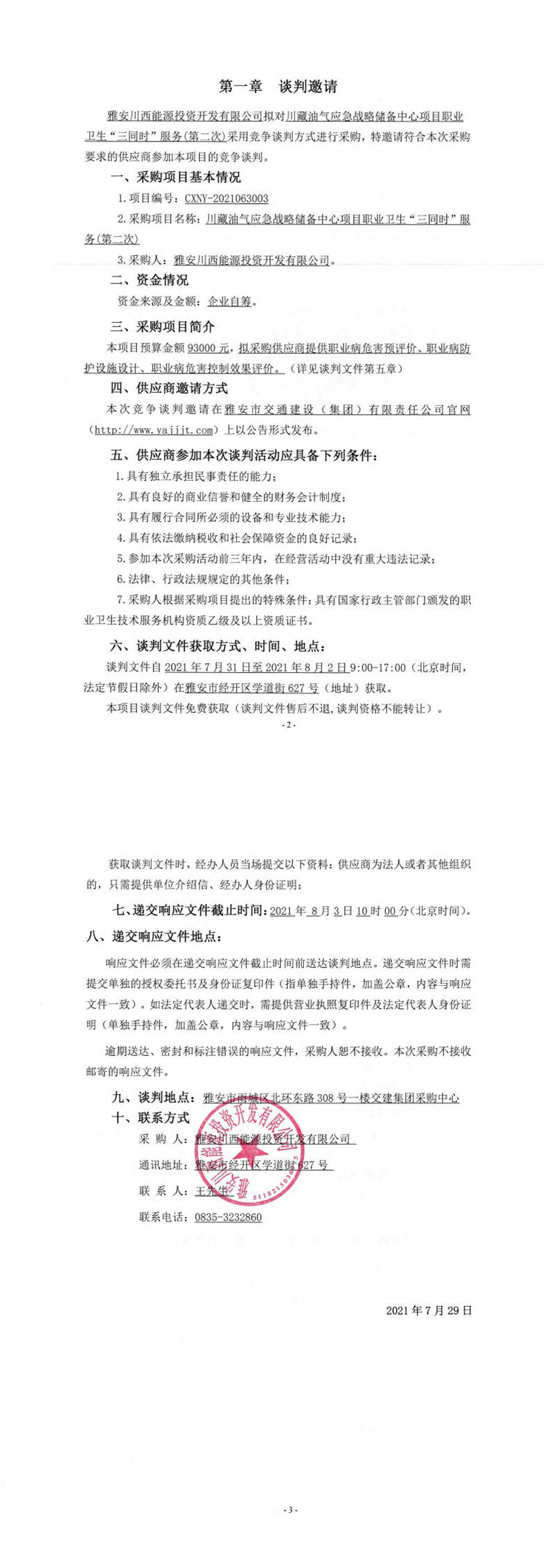 雅安川西能源投資開(kāi)發(fā)有限公司川藏油氣應(yīng)急戰(zhàn)略?xún)?chǔ)備中心項(xiàng)目職業(yè)衛(wèi)生“三同時(shí)”服務(wù)(第二次)競(jìng)爭(zhēng)談判公告
