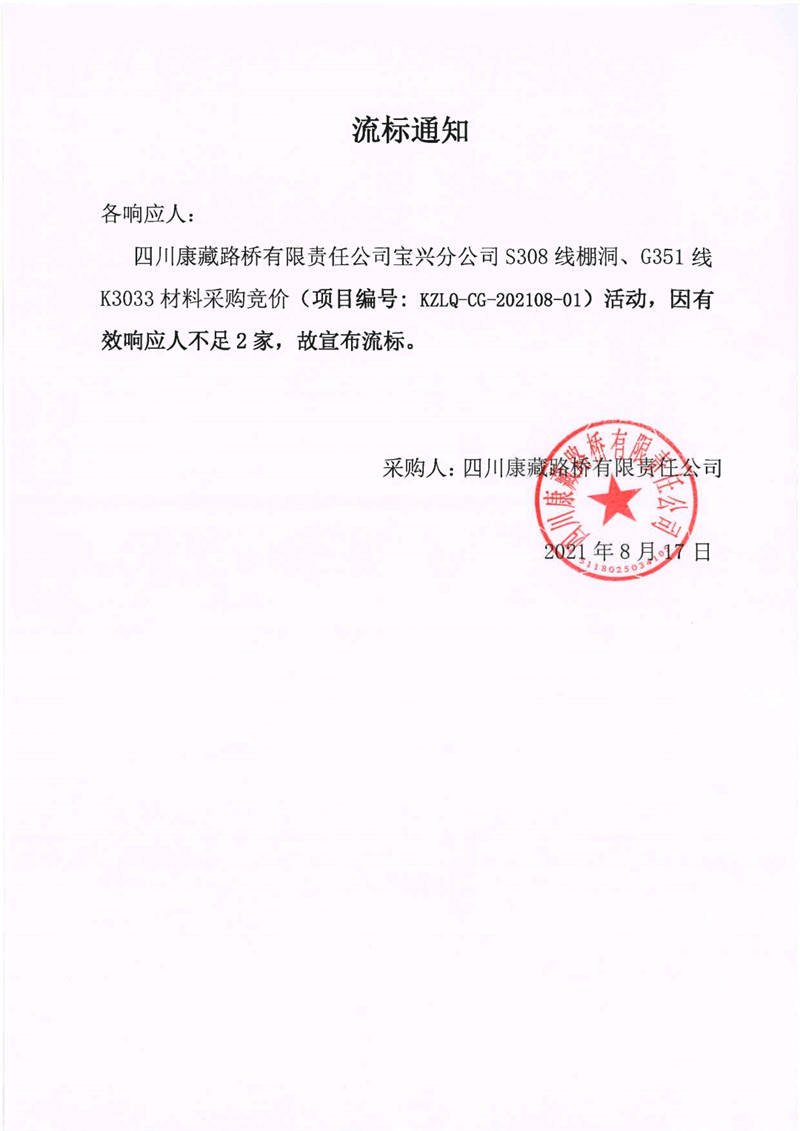 四川康藏路橋有限責(zé)任公司寶興分公司S308線棚洞、G351線K3033材料采購競價(jià)流標(biāo)通知