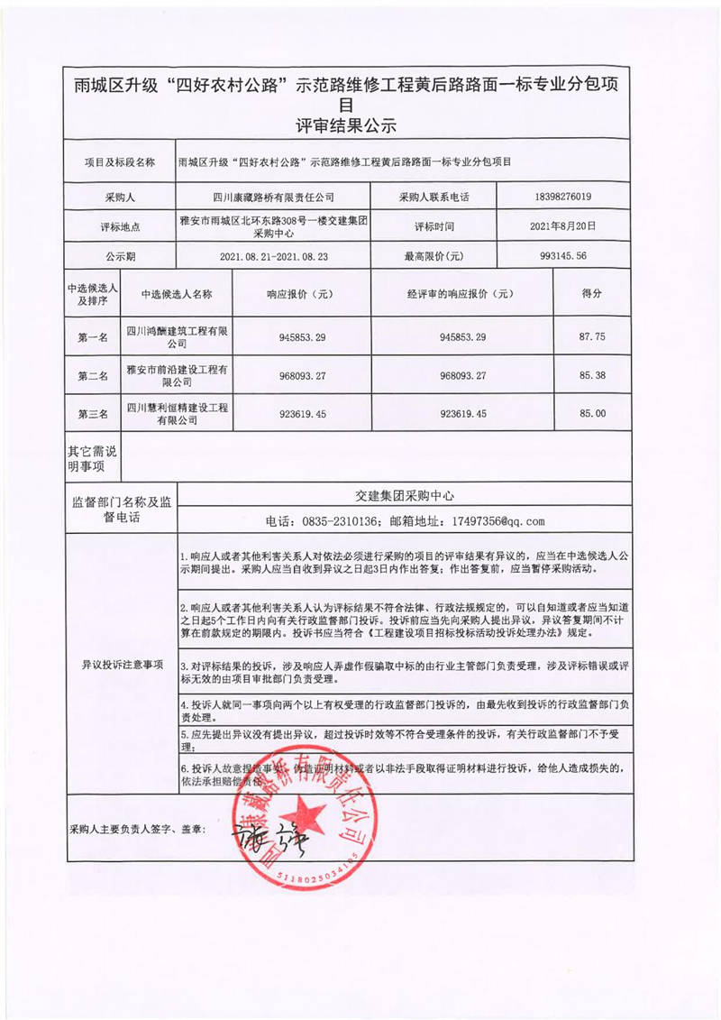 四川康藏路橋有限責(zé)任公司雨城區(qū)升級(jí)“四好農(nóng)村公路”示范路維修工程黃后路路面一標(biāo)專(zhuān)業(yè)分包項(xiàng)目評(píng)審結(jié)果公示