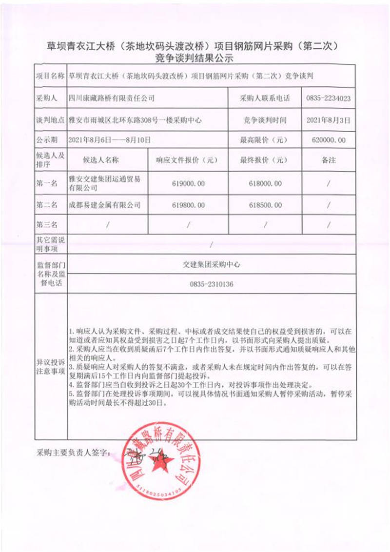 四川康藏路橋有限責(zé)任公司草壩青衣江(茶地坎碼頭渡改橋)項(xiàng)目鋼筋片采購(gòu)競(jìng)爭(zhēng)談判結(jié)果公示