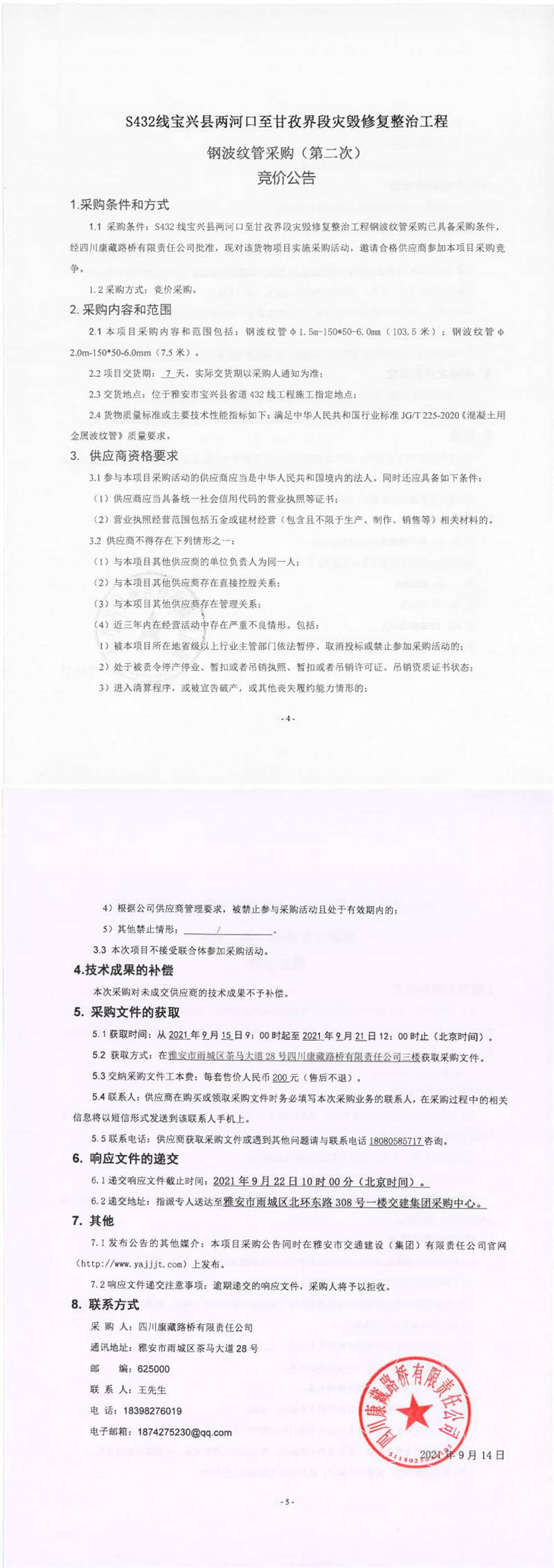 四川康藏路橋有限責(zé)任公司S432線寶興縣兩河口至甘孜界段災(zāi)毀修復(fù)整治工程鋼波紋管采購(第二次)競價公告