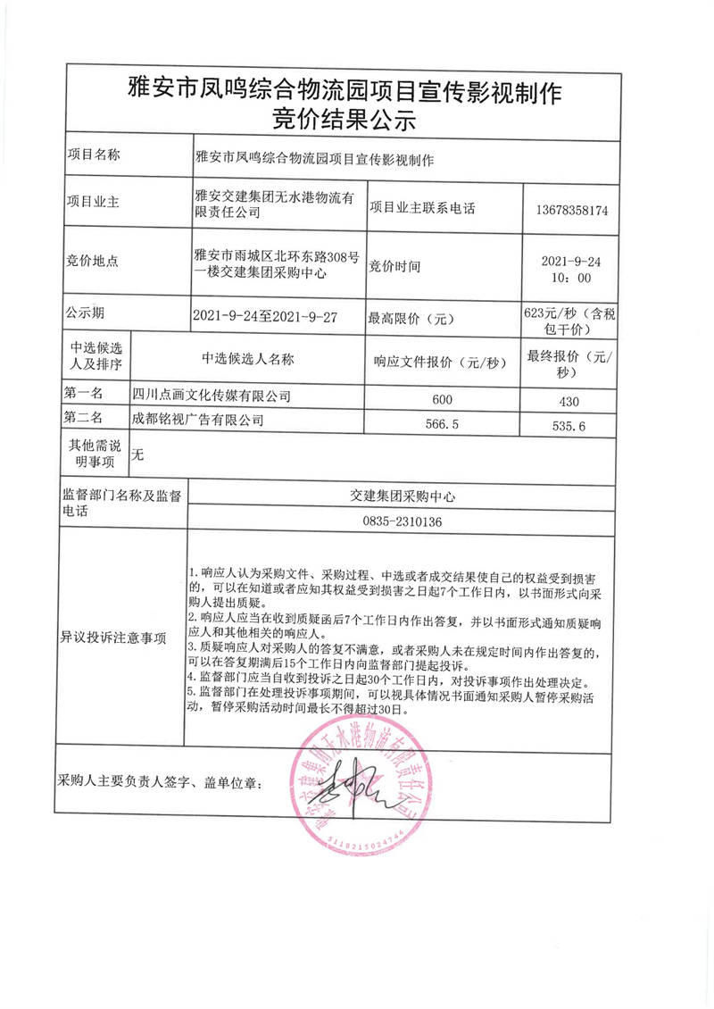 雅安交建集團(tuán)無水港物流有限責(zé)任公司雅安市鳳鳴綜合物流園項(xiàng)目宣傳影視制作競(jìng)價(jià)結(jié)果公示