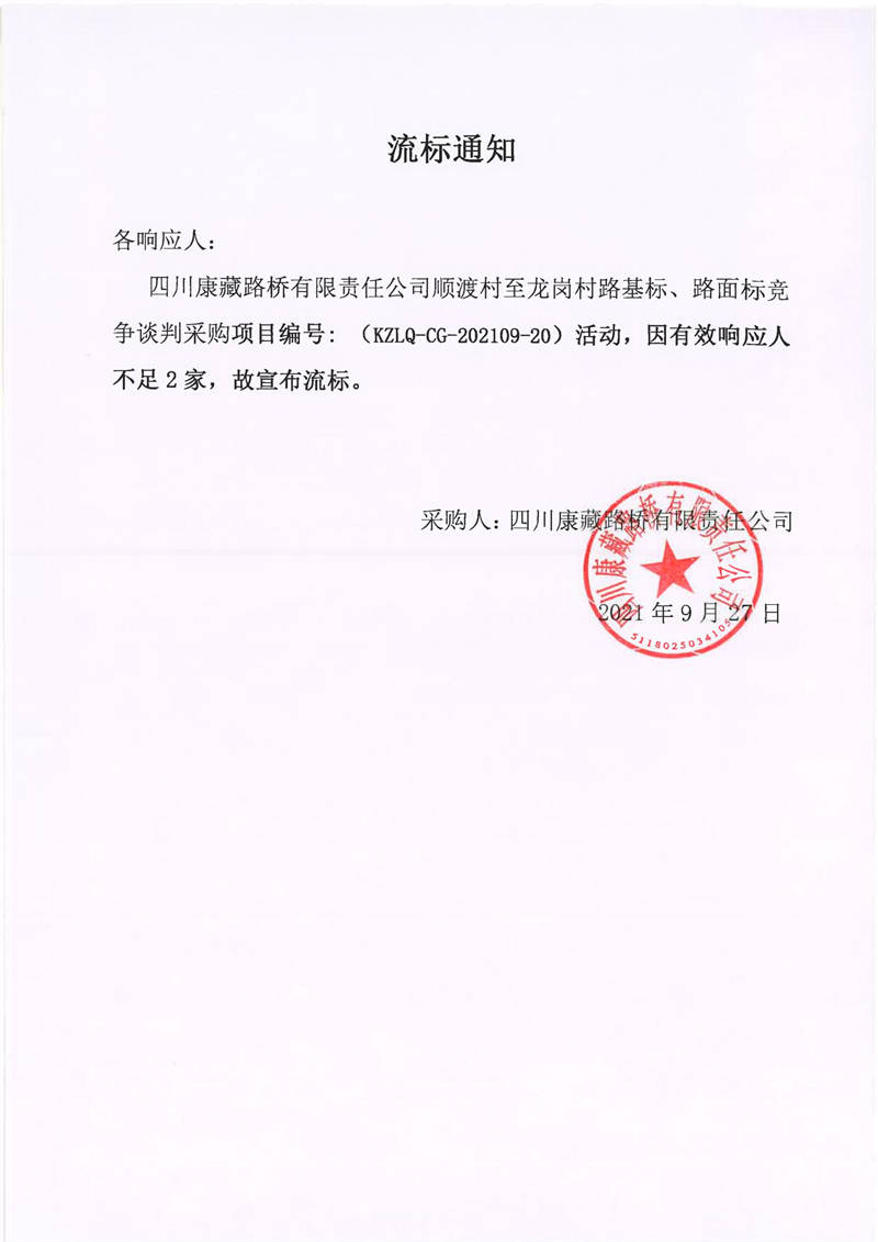 四川康藏路橋有限責(zé)任公司順渡村至龍崗村路基標、路面標競爭談判采購項目流標通知