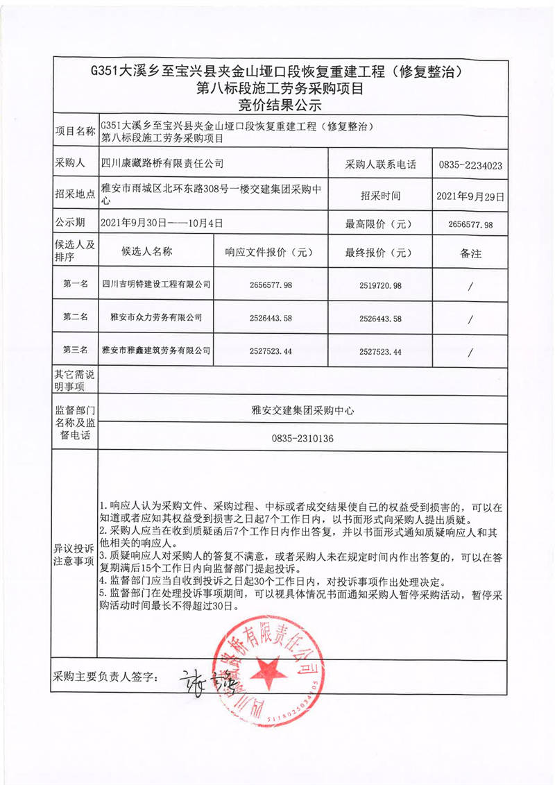 四川康藏路橋有限責(zé)任公司G351大溪鄉(xiāng)至寶興縣夾金山埡口段恢復(fù)重建工程(修復(fù)整治)第八標(biāo)段施工勞務(wù)采購項(xiàng)目競價(jià)結(jié)果公示