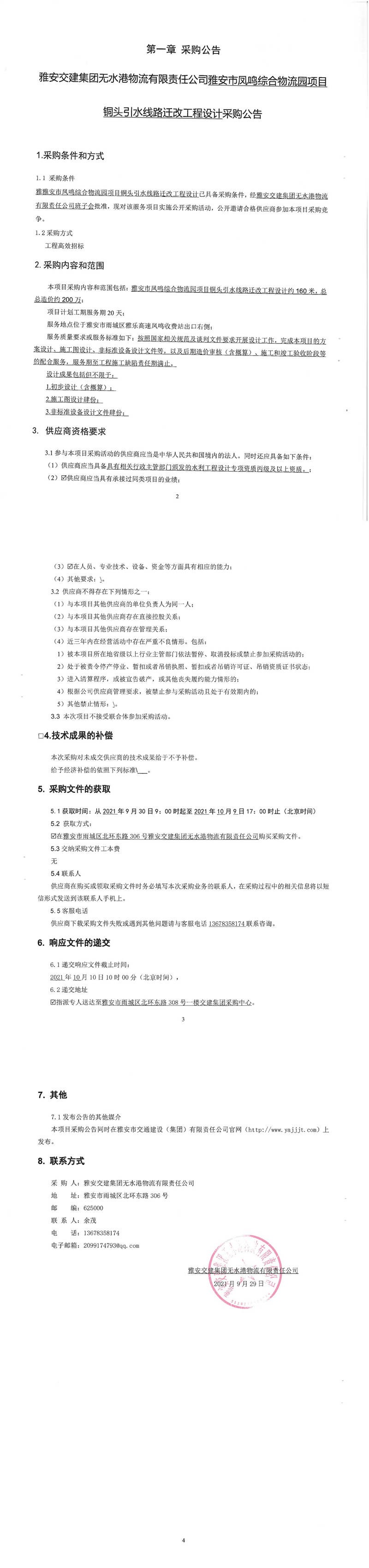 雅安交建集團無水港物流有限責任公司雅安市鳳鳴綜合物流園項目銅頭引水線路遷改工程設計采購公告