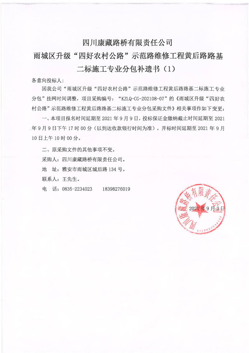 四川康藏路橋有限責(zé)任公司雨城區(qū)升級“四好農(nóng)材公路”示范路維修工程黃后路路基二標(biāo)施工專業(yè)分包補遺書(1)