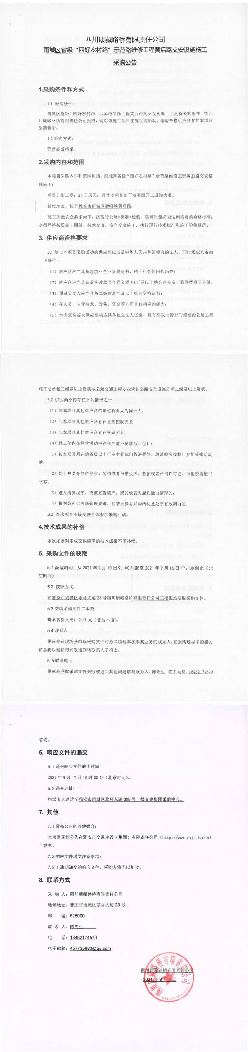 四川康藏路橋有限責(zé)任公司雨城區(qū)省級(jí)“四好農(nóng)村路”示范路維修工程黃后路交安設(shè)施施工采購(gòu)公告