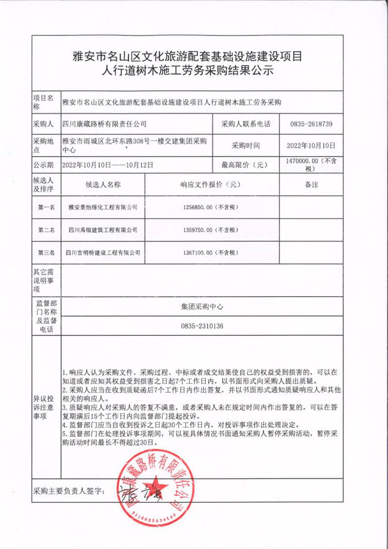 四川康藏路橋有限責任公司雅安市名山區(qū)文化旅游配套基礎(chǔ)設(shè)施建設(shè)項目人行道樹木施工勞務采購結(jié)果公示