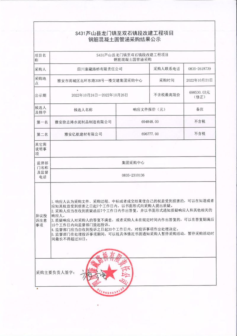 四川康藏路橋有限責(zé)任公司S431蘆山縣龍門鎮(zhèn)至雙石鎮(zhèn)段改建工程項(xiàng)目鋼筋混凝土圓管涵采購(gòu)結(jié)果公示